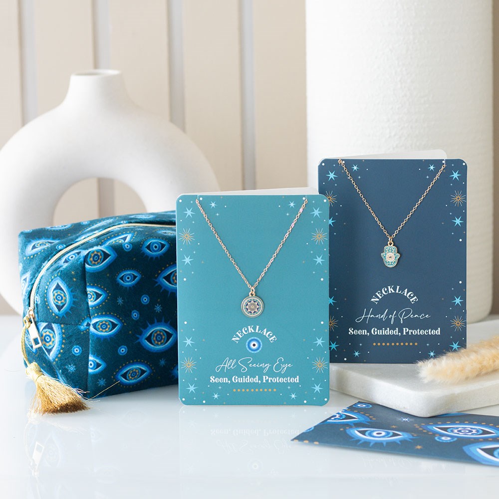 Keep your everyday essentials safe in cosmic style with this dark blue velvet makeup bag, featuring a mystical all-seeing eye design surrounded by stars. With its luxe velvet texture, celestial gold-tone print, and elegant zip closure finished with a gold tassel, this bag is as practical as it is magical.
