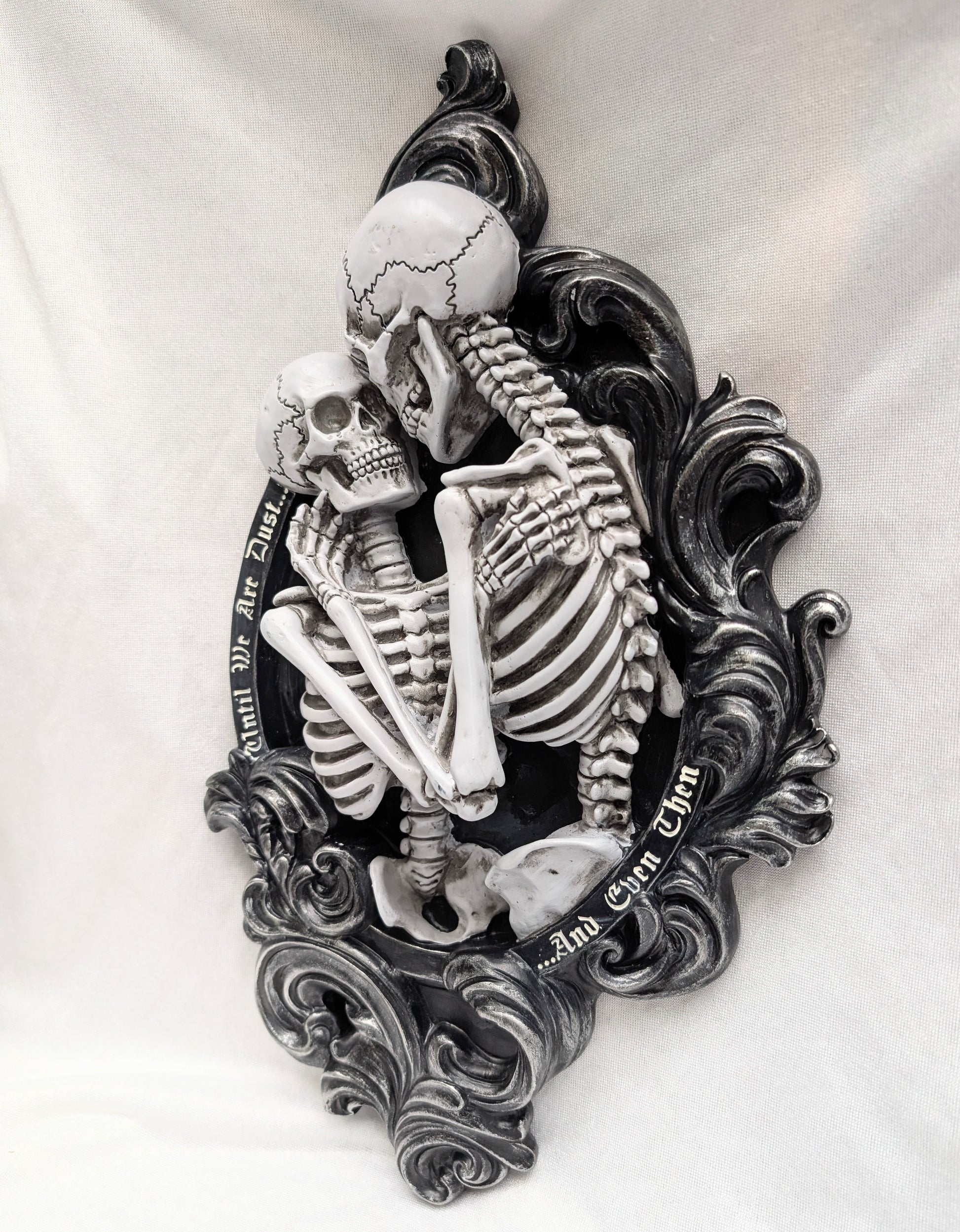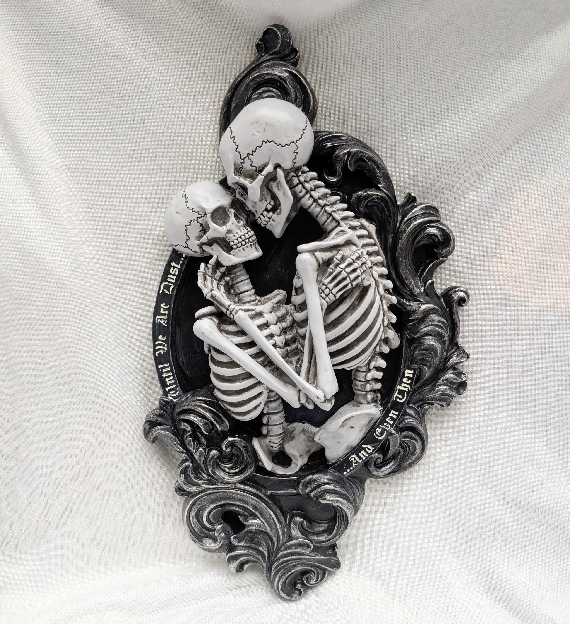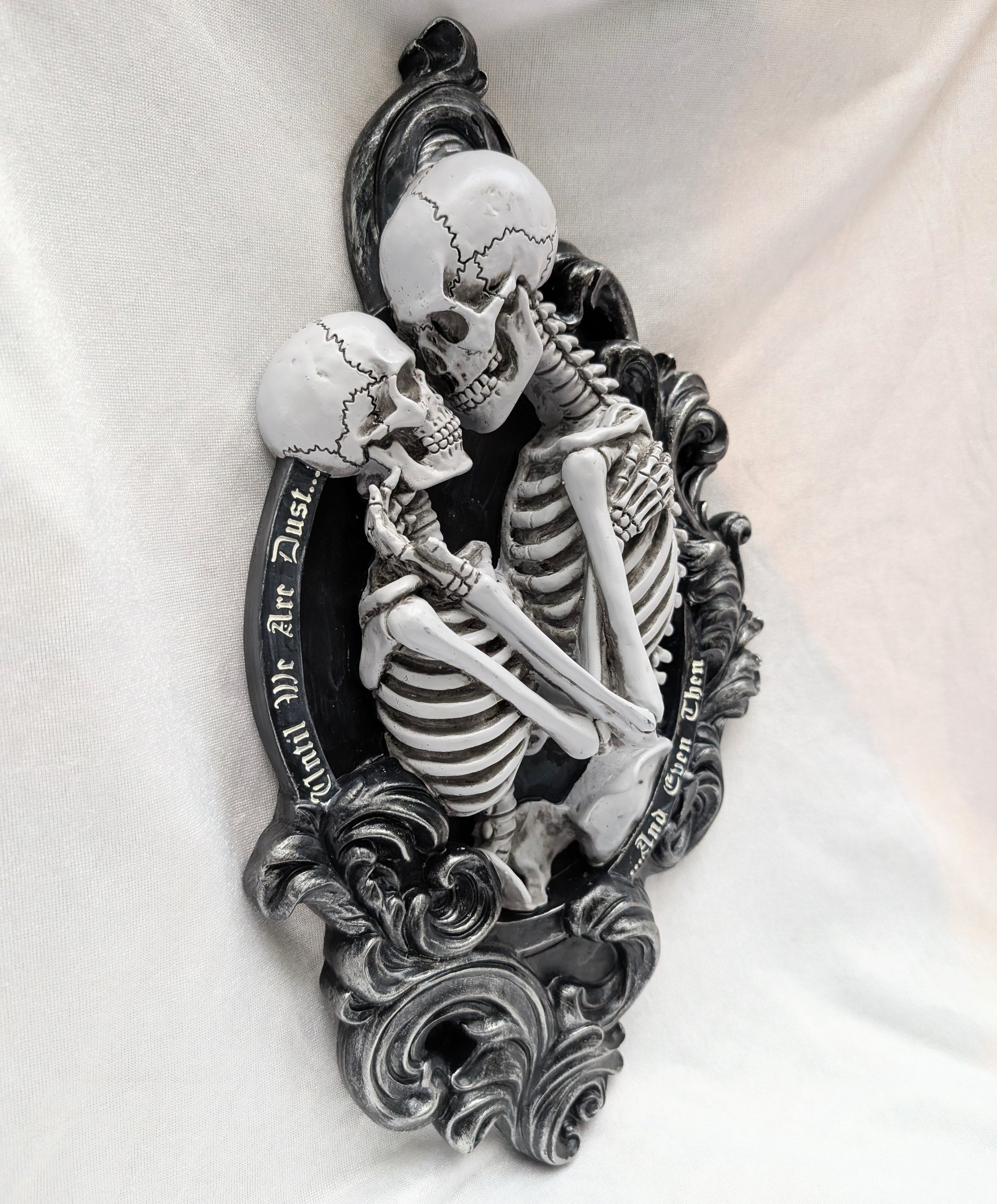 Elevate the ambiance of any room with this stunning And Even Then Wall Plaque, designed to add a touch of gothic romance to your decor. The intricate design showcases a pair of skeleton lovers, locked in a tender embrace, symbolizing eternal love that transcends even death. The hauntingly beautiful words 'Until We Are Dust…And Even Then' encircle the lovers, adding a poetic and mysterious element to the piece. Crafted with meticulous attention to detail, this wall plaque is made from high-quality resin and hand-painted to perfection, ensuring a unique and exquisite finish.