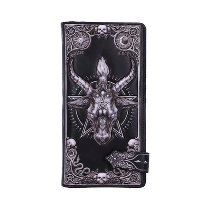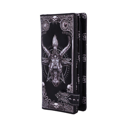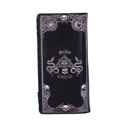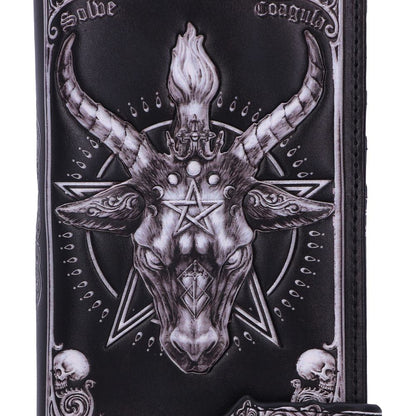 This unique and eye-catching purse is a must-have accessory for anyone looking to make a bold statement. The front of the purse features a striking design of a triple-horned sabbatic goat with a torch between its horns and a pentagram on its forehead. The intricate gothic patterning and imagery surrounding the goat's head adds to the mysterious and mystical vibe of the purse. The Latin words SOLVE (separate) and COAGULA (join together) further enhance the esoteric feel of the design, making it a perfect choice for those with an interest in the occult.