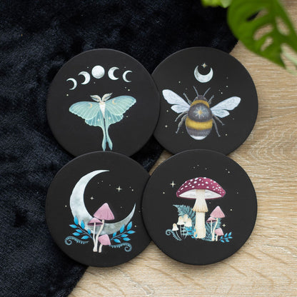Combining nature and celestial elements, these coasters showcase a mesmerizing design with durable, high-quality materials. From a delicate luna moth to a serene mushroom landscape, these coasters add a touch of wonder to any occasion.