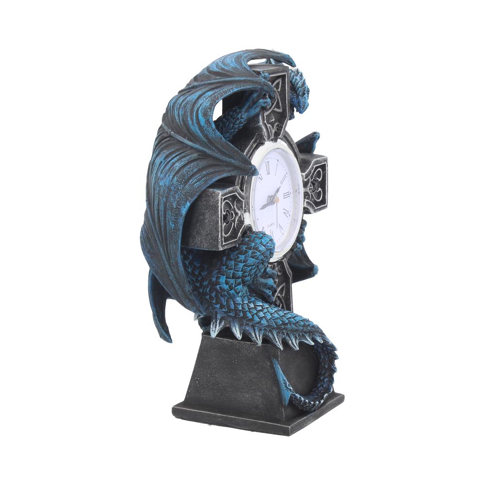 The blue Dragon atop a black Celtic cross stands guard over time.