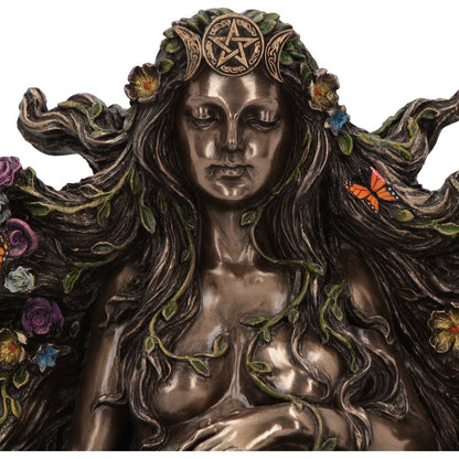 Her hair is filled with life, brimming with brightly coloured flowers and intricately detailed butterflies, beautifully capturing the spirit of Gaea. She also wears a crown featuring the Triple Moon Goddess symbol, representing the eternal cycle of birth, life and death.