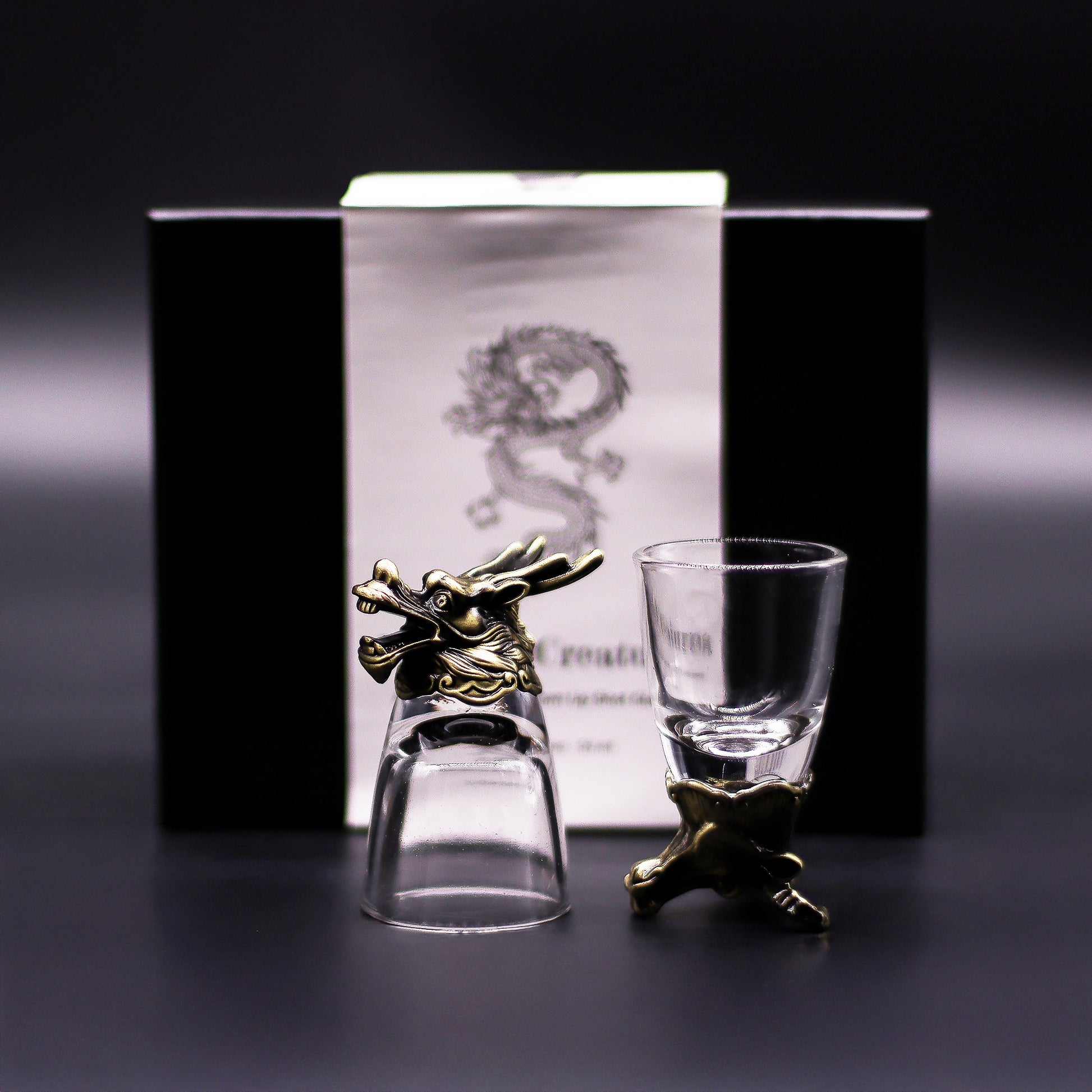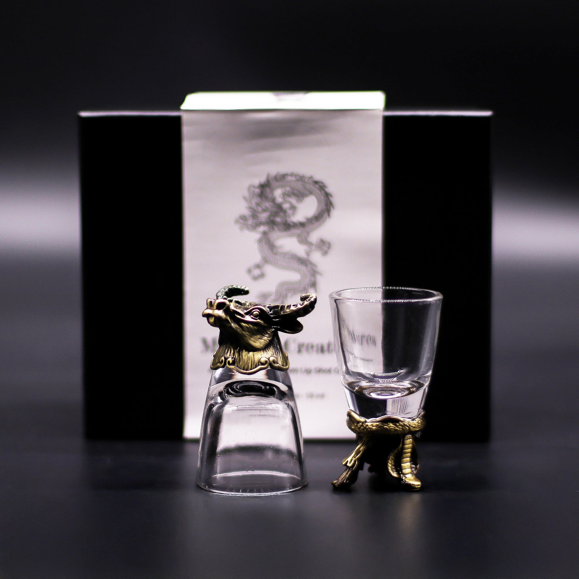 Every shot glass features a clear glass top elegantly set upon a finely detailed antique bronze-style base, representing six mystical animals: