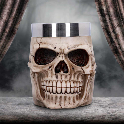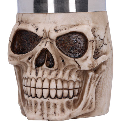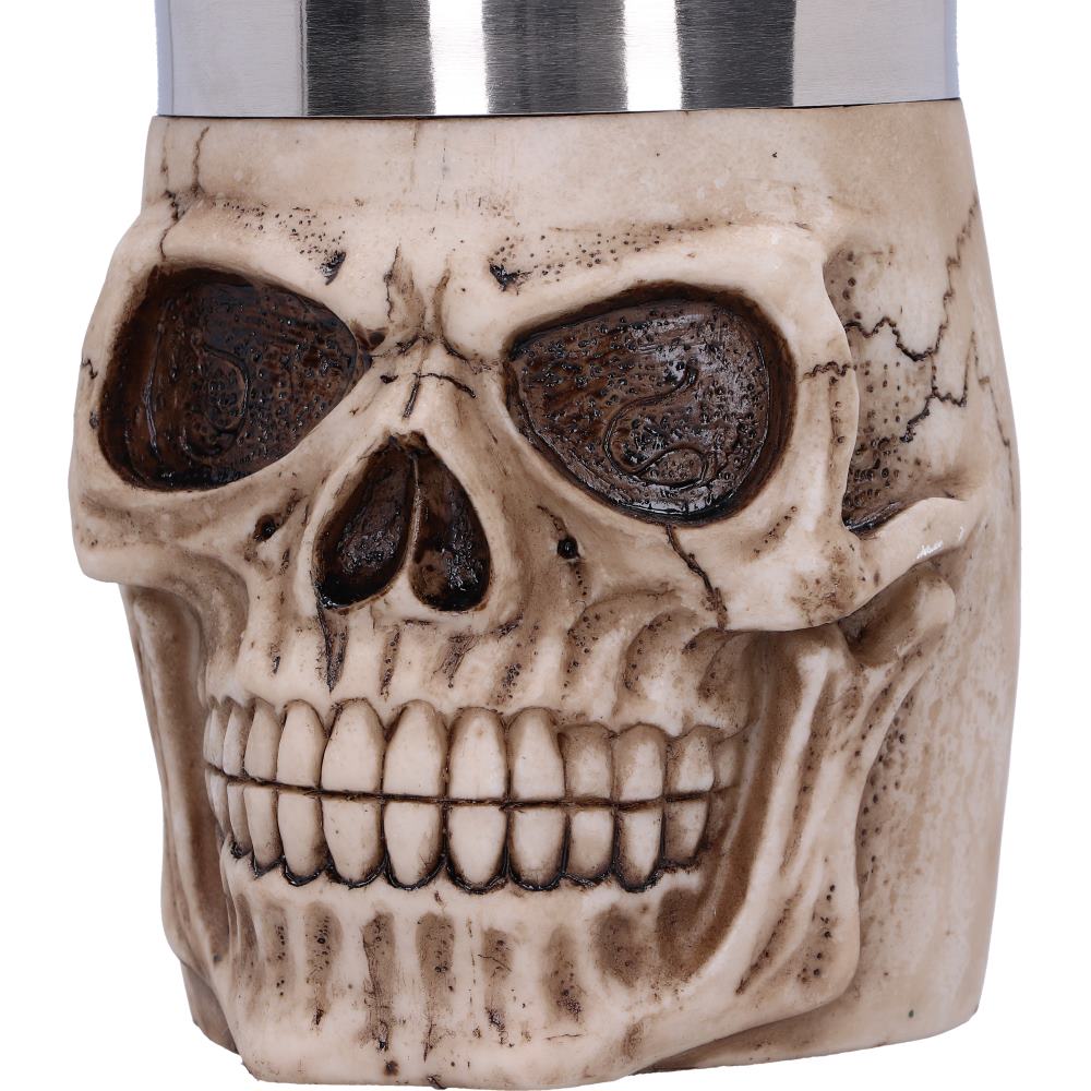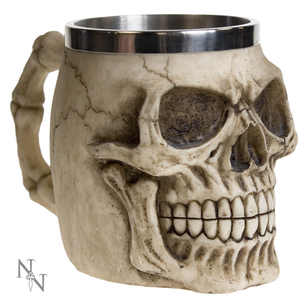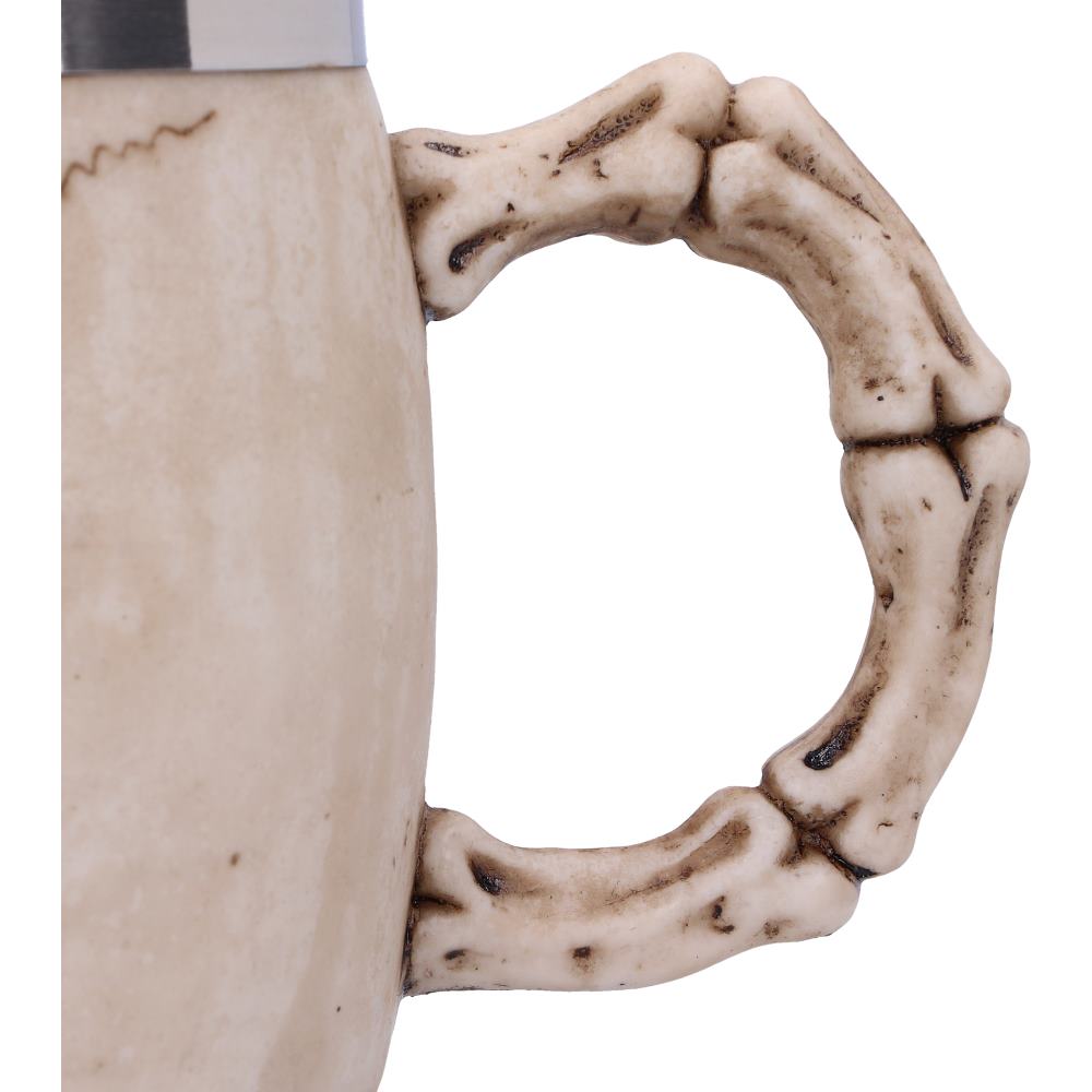 Staring straight forwards, the body of the tankard is a large grimacing skull, the sunken eye sockets and nose hole stained brown, the temples cracked. The handle is a curve of finger bones firmly fixed to the back of the skull.