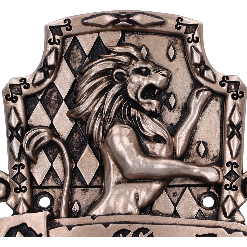Featuring a lion at the centre of this piece which is the emblematic animal of the Gryffindor house, whose members are characterised by their bravery, courage and determination. Cast in the finest resin before being expertly hand-painted, the knocker part of this piece is a solid metal ring, weighted to provide a loud knock.