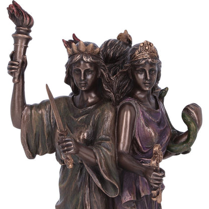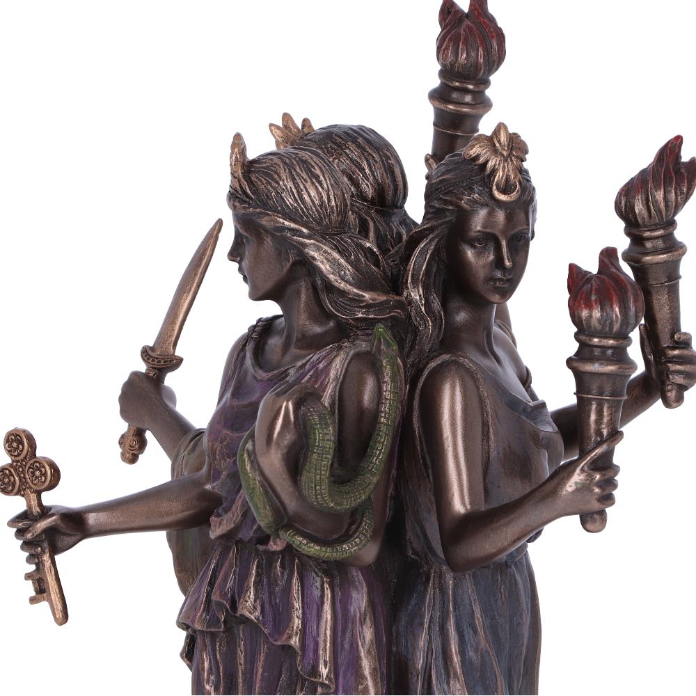 Hecate, a prominent figure in ancient Greek religion and mythology, is depicted in her triple form in this enchanting figurine. Holding a pair of torches or a key, she symbolizes her association with crossroads and entrance-ways. As the goddess of light, magic, and witchcraft, she embodies the mystical and supernatural. Her vast knowledge of herbs and poisonous plants, along with her connection to ghosts, necromancy, and sorcery, adds an air of mystery and intrigue to her persona.
