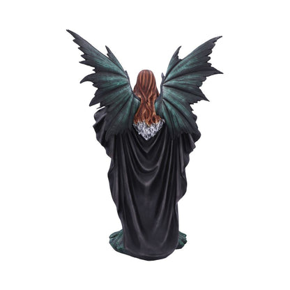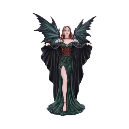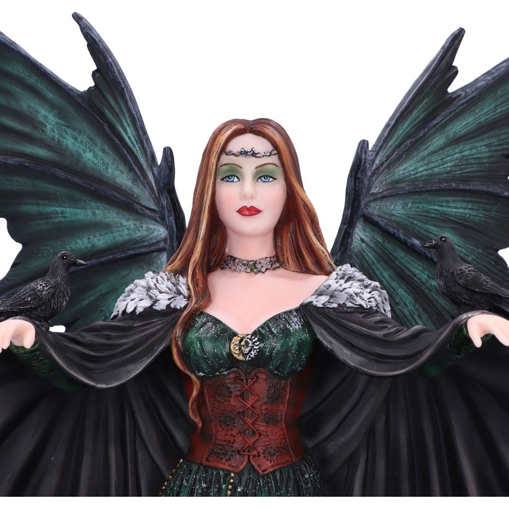 This enchanting statue features a captivating fairy, wearing a shimmering green gown with a black cloak draped over her shoulders. Her magnificent wings are black with subtle hues of green, her raised arms provide a perch for her two raven companions.