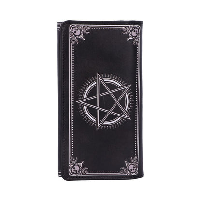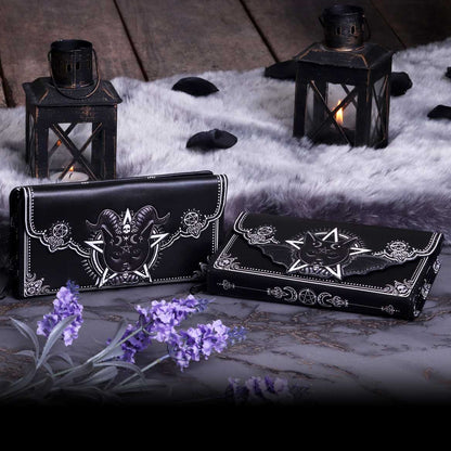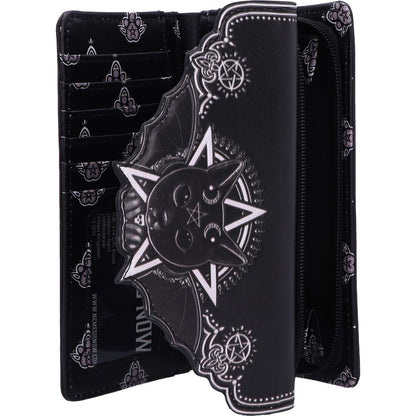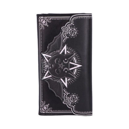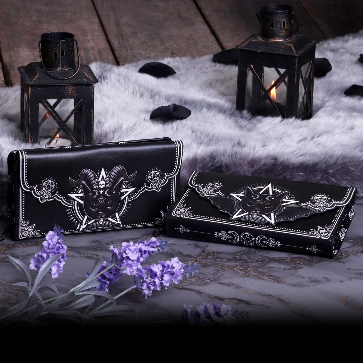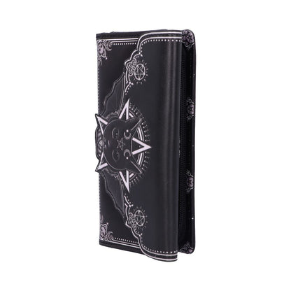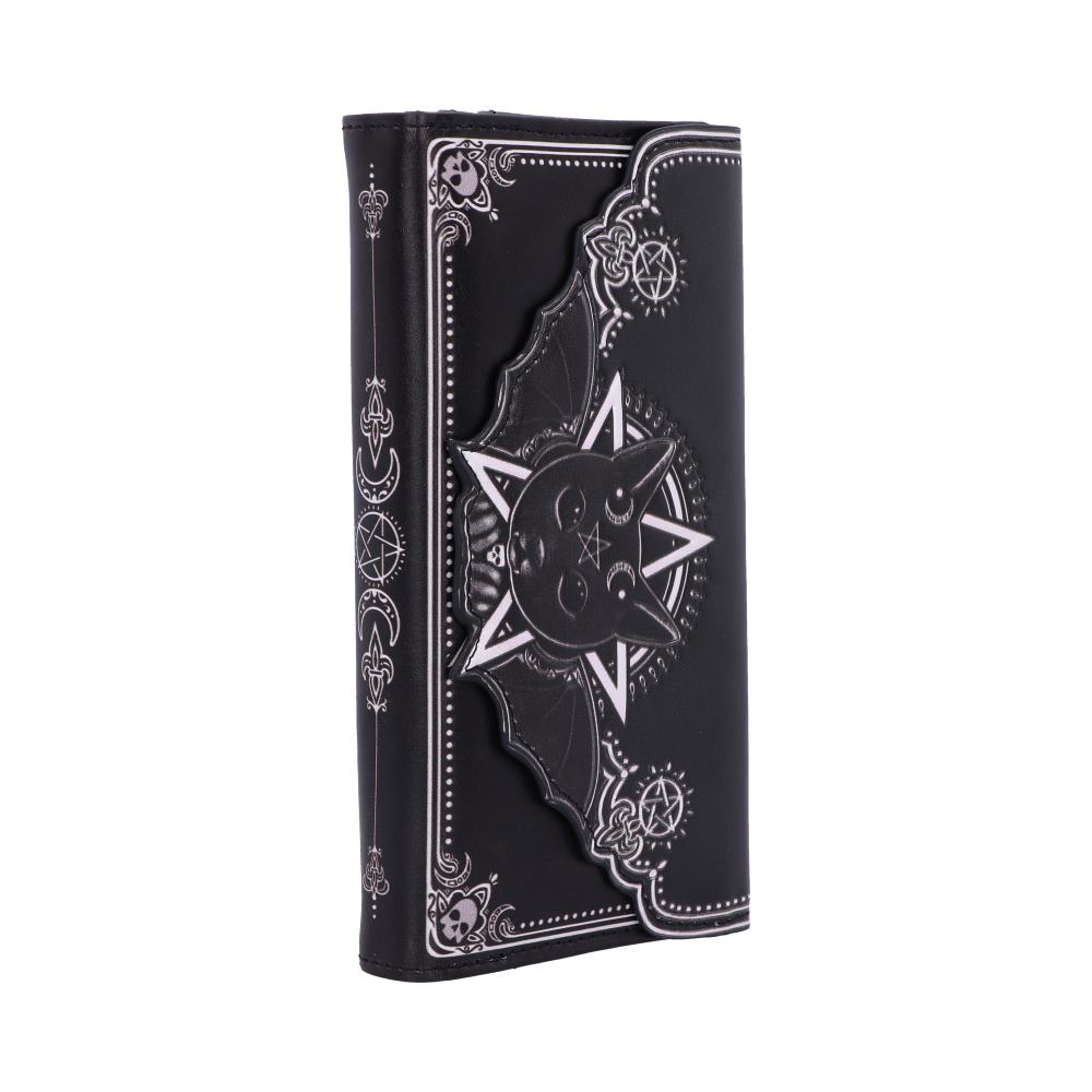 The jet black purse features beautiful embossed detailing to create the well loved face, wings and paws of Malpuss on the main flap, with ornate silver decorations around the edges of the purse along with skulls and pentagrams. The back of the purse features a large pentagram design with borders to match the front.