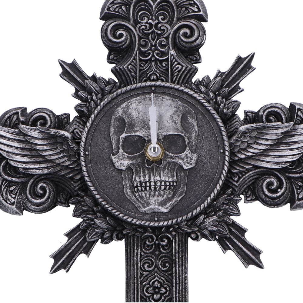 Add a touch of haunting elegance to your home with this dramatic gothic timepiece, where symbolism meets function in a striking design. The clock face is set within a winged skull centerpiece, framed by intricate silver detailing and ornate gothic textures that create a bold statement piece for any room.