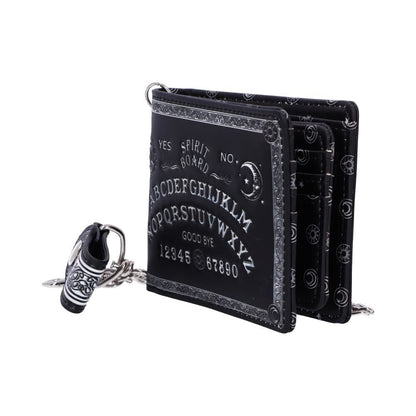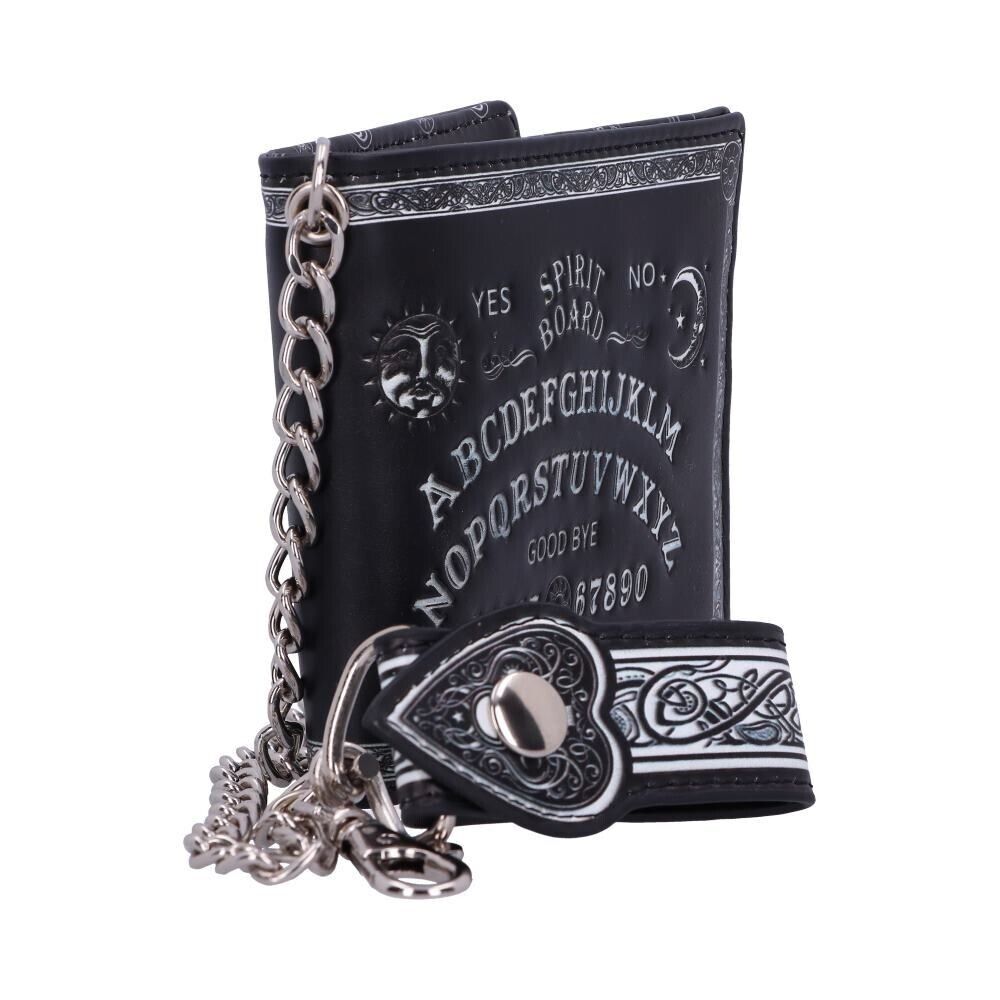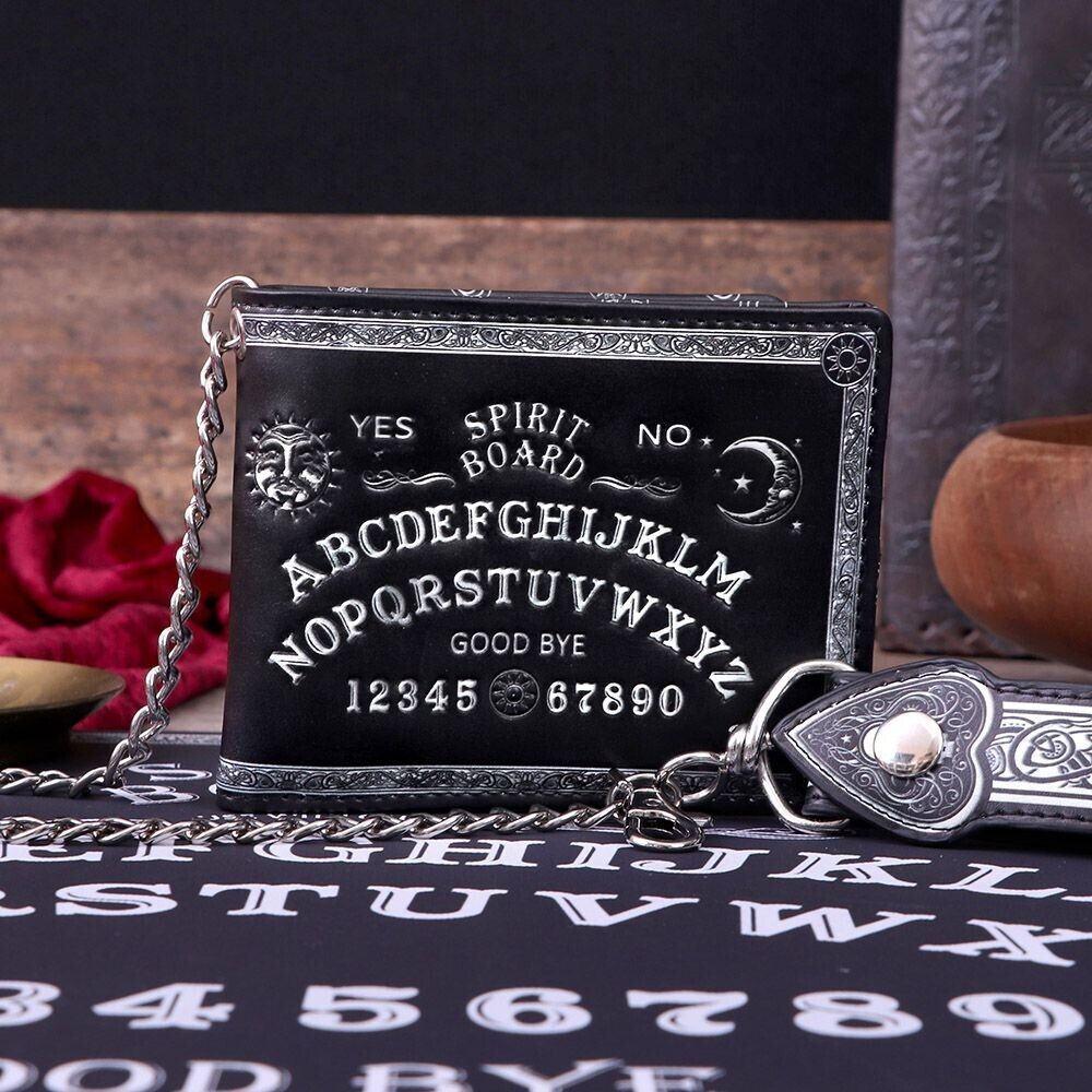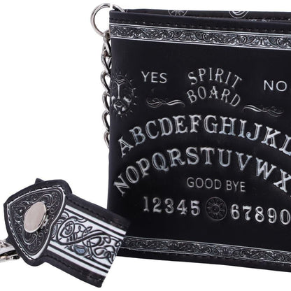 This wallet features a stunning spirit board motif, intricately bordered with baroque patterns that evoke a sense of the supernatural. The striking black background showcases the alphabet in an elegant arc, flanked by ornate planchettes poised for action. With numbers 0 to 9 and the words YES and NO, this wallet is not just a stylish accessory but a conversation starter that hints at the mysteries of the spirit world.