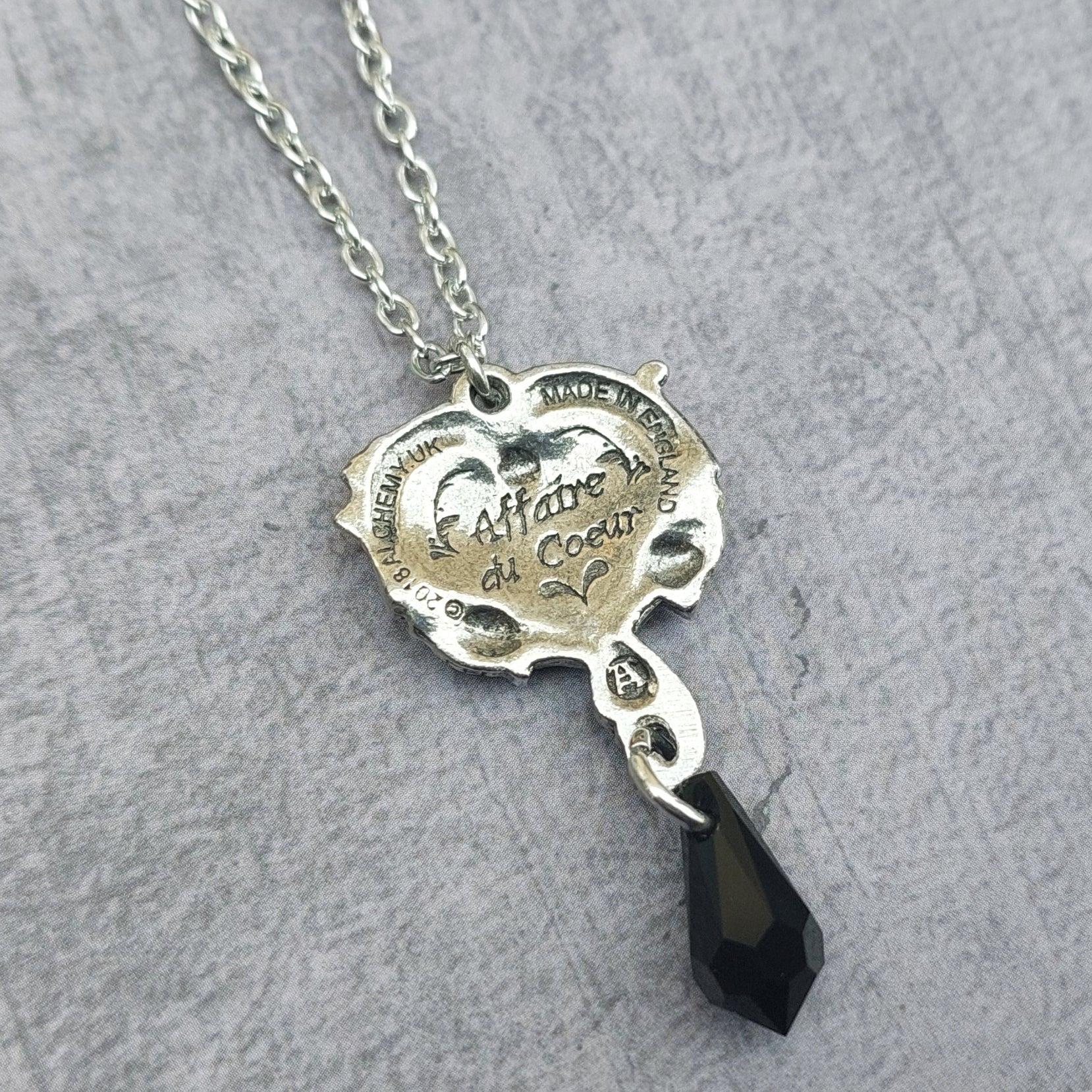 Surrounding the heart is an antiqued pewter Baroque frame, intricately detailed with a skull profile on either side, symbolising mortality, devotion beyond time, and the balance between life and death. Suspended beneath the heart is a black crystal teardrop, adding movement and a touch of dramatic elegance.