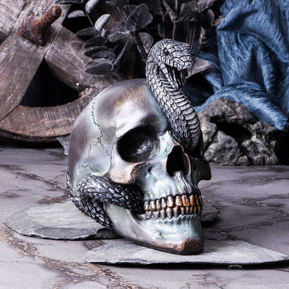 Crafted from high-quality resin, this skull features a terrifying serpent emerging from its eye socket, warning intruders to stay away.