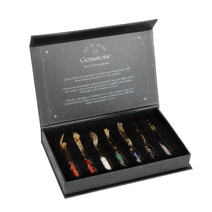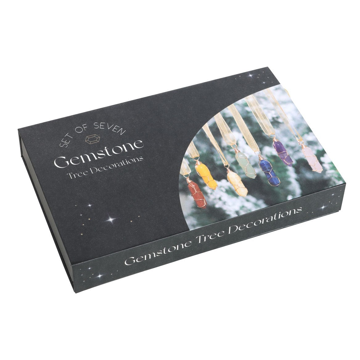 Enhance your Christmas tree with this set of 7 hanging crystals, each chosen for its unique spiritual properties. Featuring goldstone for beauty, orange carnelian for motivation, yellow jade for positivity, green aventurine for good luck, sodalite for harmony, amethyst for tranquility, and rose quartz for togetherness, these crystals will amplify festive spirits throughout the Christmas season.