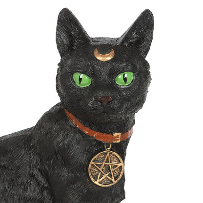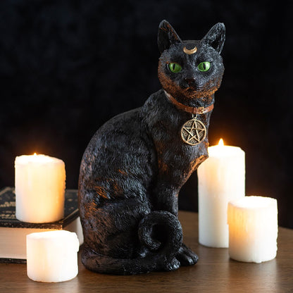 Adorned with striking green eyes that seem to hold secrets and a pentacle detail on its collar, this figurine is not just an ornament; it's a conversation starter that brings a touch of magic to any space.