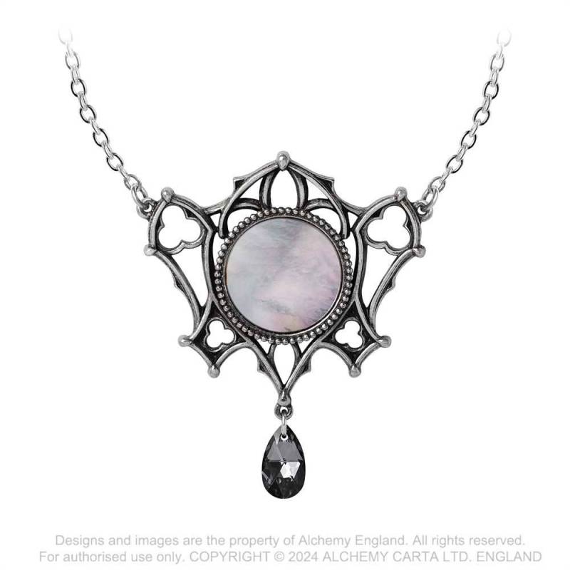 Crafted from intricately detailed antiqued pewter, this statement necklace features Gothic tracery that captures the essence of a bygone era. At its heart lies a dark mother of pearl disc, symbolizing the depths of despair, while a stunning silver night color Austrian crystal adds a touch of ethereal elegance, making it perfect for your most enigmatic occasions.