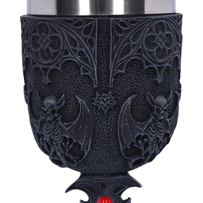 Indulge in the dark and mysterious with this stunning goblet featuring skeletal vampire bats and intricate cathedral archways. The stem of the cup is a detailed cross with a red jewel on top, adding a touch of elegance to this gothic piece.
