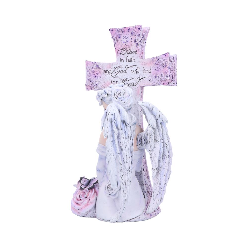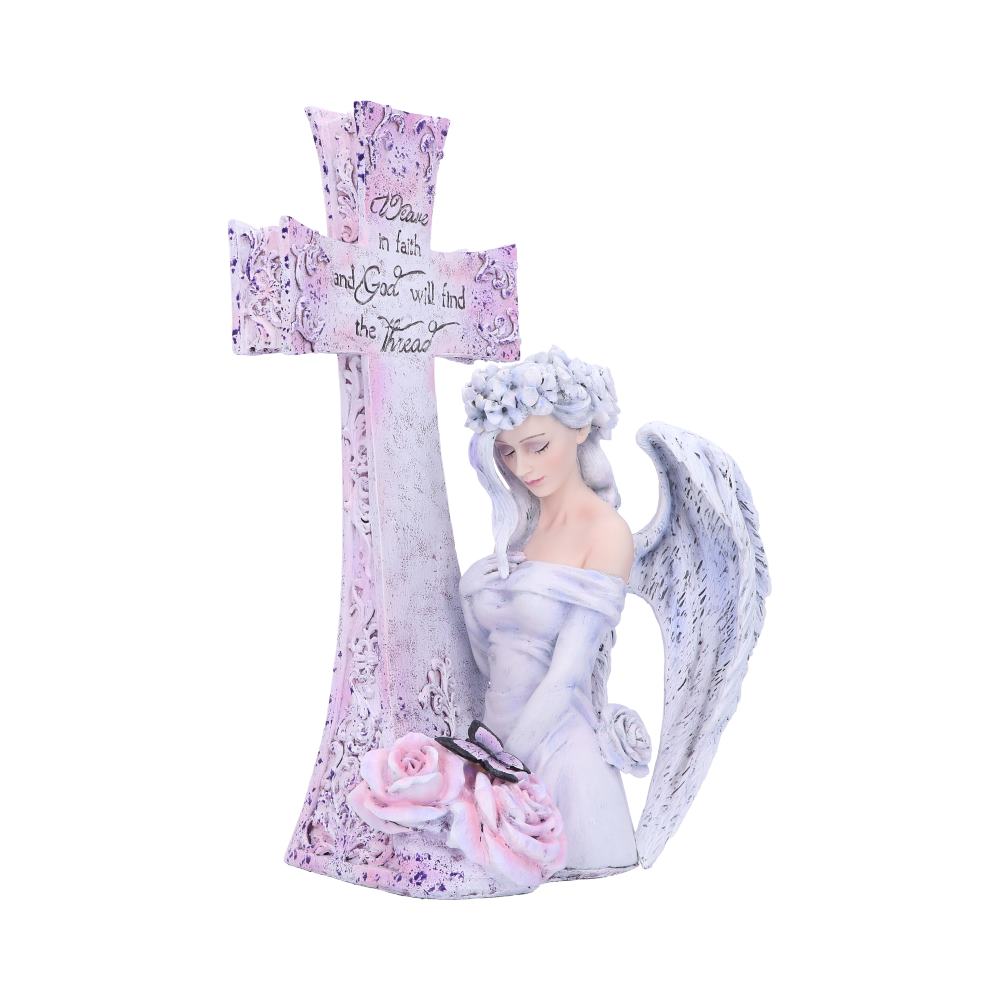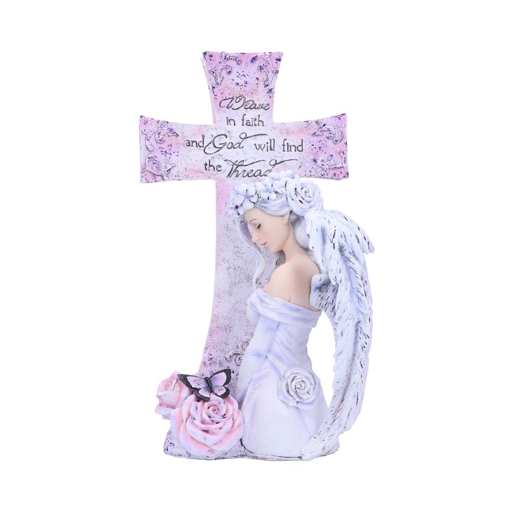 Enchanting, elegant and pure, this beautiful white angel stands close to the pink cross which has the words 'Weave in faith and God will find the Thread' emblazoned onto it.