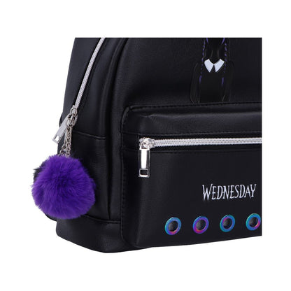 Crafted from sleek black faux leather with a gorgeous purple and black striped lining, this backpack perfectly captures Wednesday's spooky aesthetic.